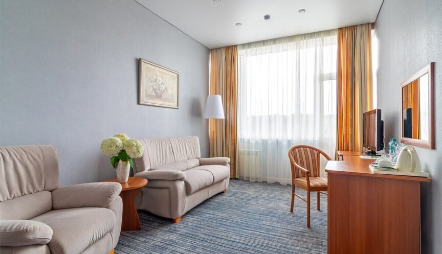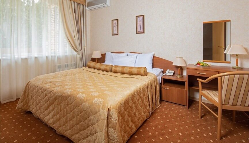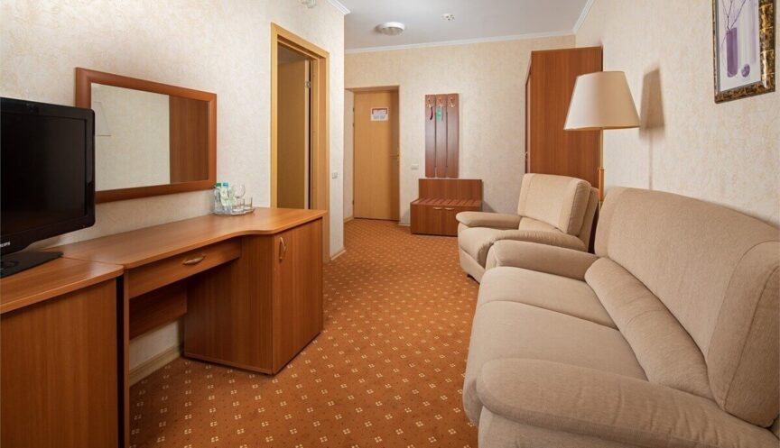 2-местный 2-комнатный люкс (площадь 30 кв. м, максимум 4 человека). В номере: бесплатный Wi-Fi, телевизор, кондиционер, ванна, фен, холодильник, 2-спальная кровать, туалет и чайный набор. Дополнительное место – раскладной диван. При размещении 4 гостей третий и четвертый турист будут спать на диване.